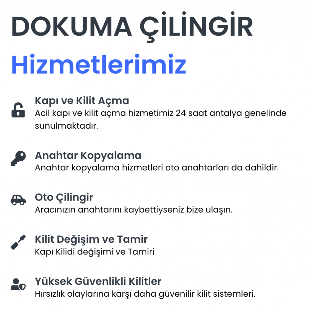 ANTALYA DOKUMA Açık Çilingir ANTALYA DOKUMA Açık Çilingir hizmetimiz, her zaman erişilebilir durumda. Günün her saati kapılarınızı açma veya kilitleme konusunda güvenilir bir destek sunuyoruz. İletişim için: 05514714762